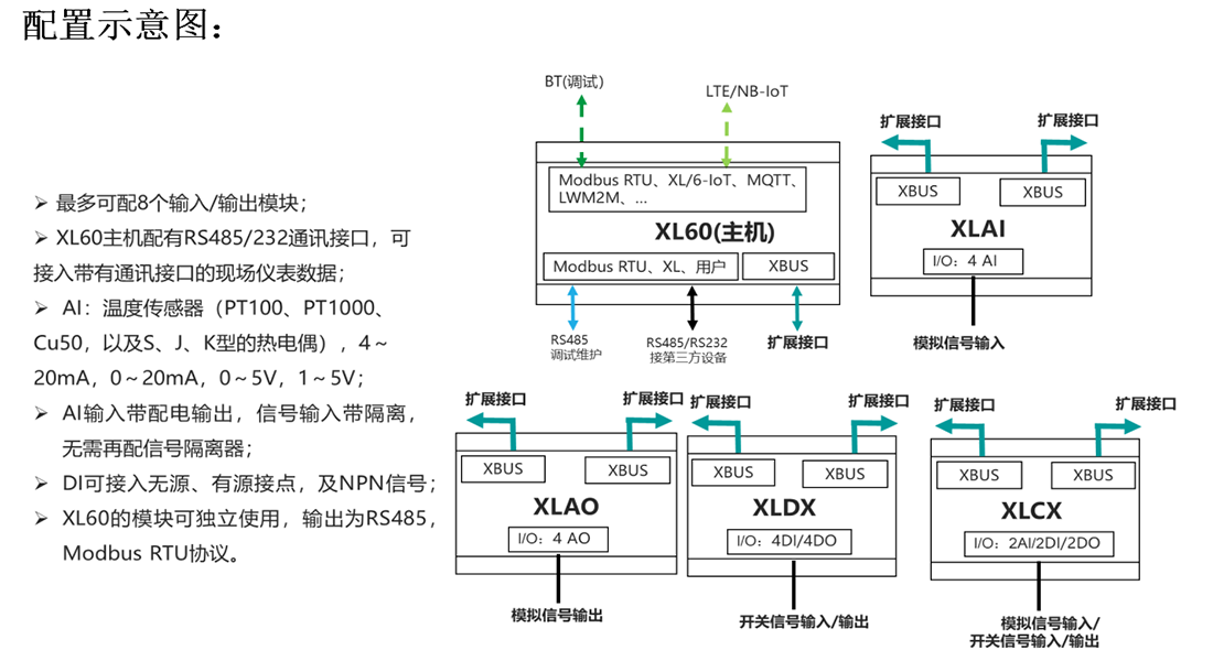 XL60無線采集裝置為模塊化設計,一臺采集裝置,由一個主機模塊,和任意不同數量的輸入、輸出模塊組成。
