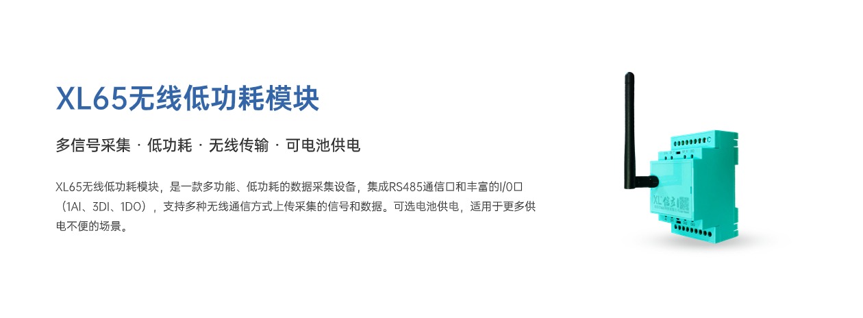 XL65無(wú)線低功耗模塊,是一款多功能、低功耗的數(shù)據(jù)采集設(shè)備,集成RS485通信口和豐富的I/0口(1AI、3DI、1DO),支持多種無(wú)線通信方式上傳采集的信號(hào)和數(shù)據(jù)。可選電池供電,適用于更多供電不便的場(chǎng)景。