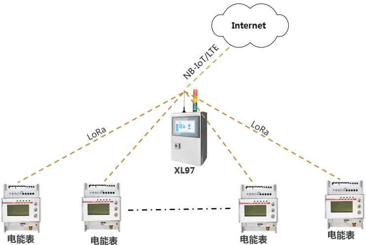 對于一家企業,需要對多臺環保設備用電數據進行采集的情況,在每個用電監測點,配置1塊DTSD3366/XL無線智能電表,采集該回路的用電數據,上傳至XL97網關終端(數據傳輸終端);