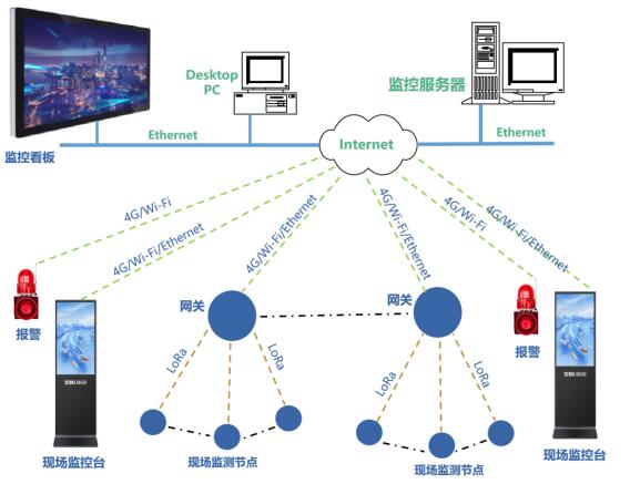l 根據(jù)工地情況,選Ethernet、Wi-Fi、4G等多種方式結(jié)合的通信方案,實現(xiàn)平臺監(jiān)控服務(wù)器和網(wǎng)關(guān)、看板、現(xiàn)場監(jiān)控臺、聲光報警器、移動終端等設(shè)備的通信。