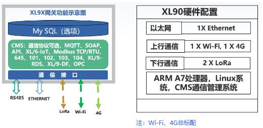 讀取采集節點的數據,通過RS485、Ethernet、4G、Wi-Fi等通信方式,接入其它系統、設備,支持MQTT、SOAP、Modbus、104、645等協議,API、Redis,XL/9-DB 寫數據庫,可為用戶開發通信協議。