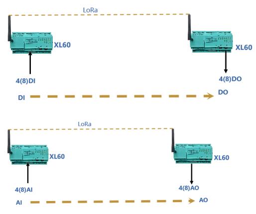 選擇一對基于LORA無線傳輸模塊的XL60主機,其中一臺配置在現場采集端,通過RS485采集現場儀表的電流、電壓、開關等信號,另一臺配置在控制儀表端,通過RS485與PLC、控制機臺、顯示儀表等連接,現場采集端的XL60可將采集到的數據通過LORA無線對傳到控制儀表端的XL60并上傳至控制儀表。