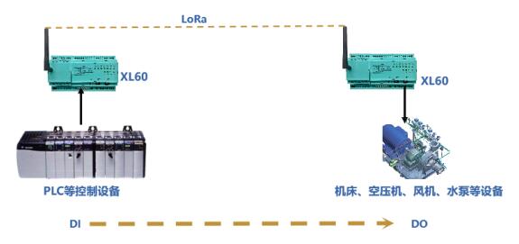 一對(duì) XL60 無(wú)線采集裝置 ,一臺(tái)與 PLC 等控制儀表連接,作信號(hào)發(fā)射端;一臺(tái)配置在生產(chǎn)現(xiàn)場(chǎng),作信號(hào)接收端。發(fā)射端的 XL60 將控制儀表的啟停命令,通過 LoRa 無(wú)線對(duì)傳到接收端,接收端的 XL60 輸出開關(guān)量信號(hào),控制設(shè)備啟、停。