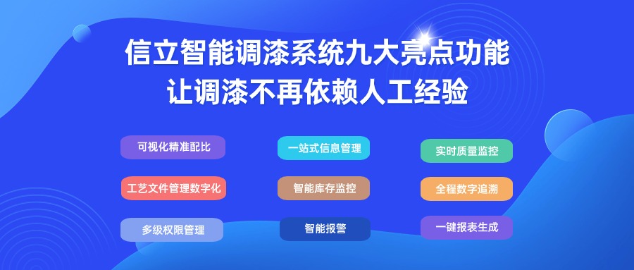 信立智能調(diào)漆系統(tǒng)XPMS,九大亮點功能設(shè)計,逐一解決調(diào)漆過程固有問題,降低對人的依賴,減少漆料浪費,更準(zhǔn)確完整地計算統(tǒng)計漆料的使用及產(chǎn)出。
