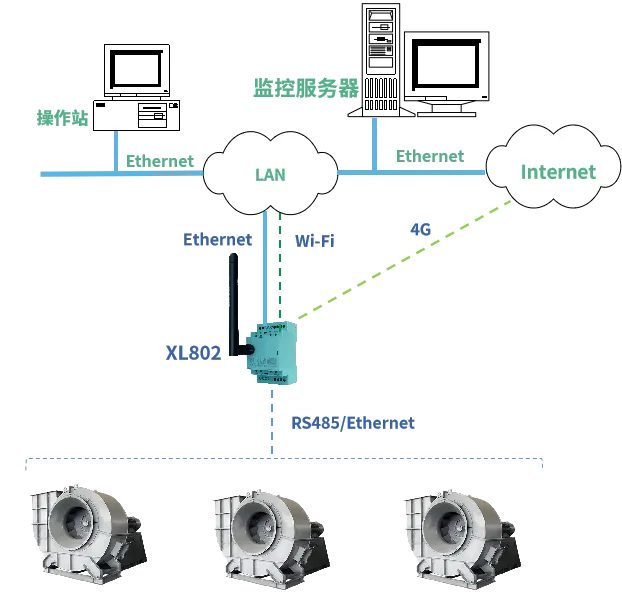選擇XL802通信主機,接入離心風(fēng)機的PLC,實時采集設(shè)備風(fēng)量、風(fēng)壓、轉(zhuǎn)速、功率等運行參數(shù)。