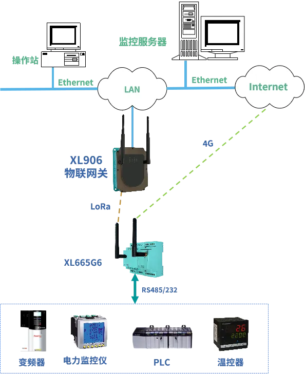 只配置有一個(gè)RS485通信口的設(shè)備,輸出的RS485信號(hào)接入XL665多路通信模塊,轉(zhuǎn)一路LoRa信號(hào)和一路4G信號(hào)輸出,同時(shí)接入現(xiàn)場(chǎng)控制中心和云平臺(tái),實(shí)現(xiàn)設(shè)備數(shù)據(jù)同時(shí)接入兩個(gè)不同的管理平臺(tái)。