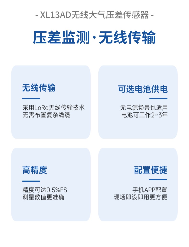 選用XL13AD無線壓差傳感器,部署于潔凈區邊界、動態風險點等關鍵點,實時監測壓差,并聯動回風管或排風管上的電動調節閥,當壓差異常時自動調節送/排風量。